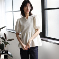 Vの切り込みにパールをあしらい、パフスリーブと腰の切替えでフェミニンなデザインに仕上げました。