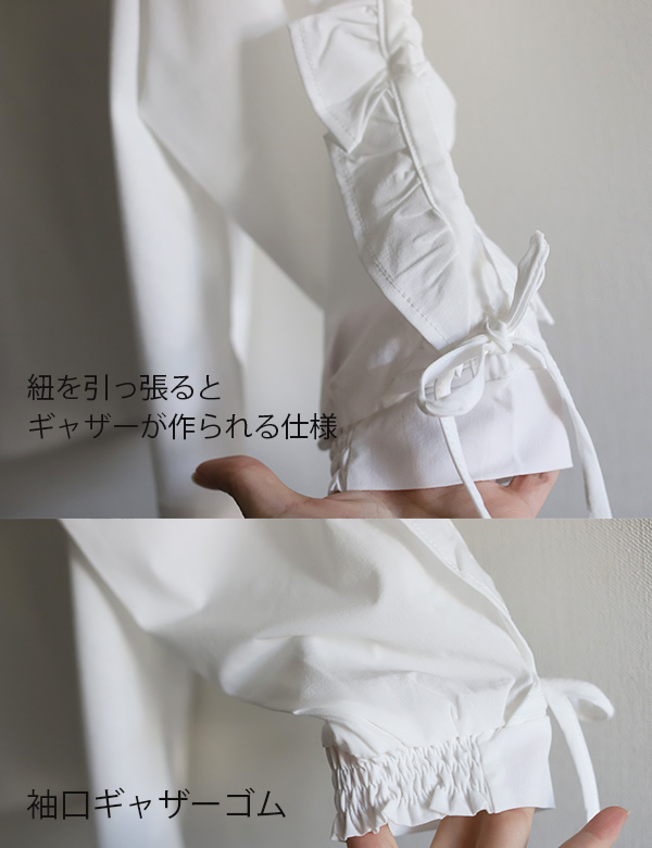 袖の左右についている紐を引っ張ると7分のフリル袖に大変身