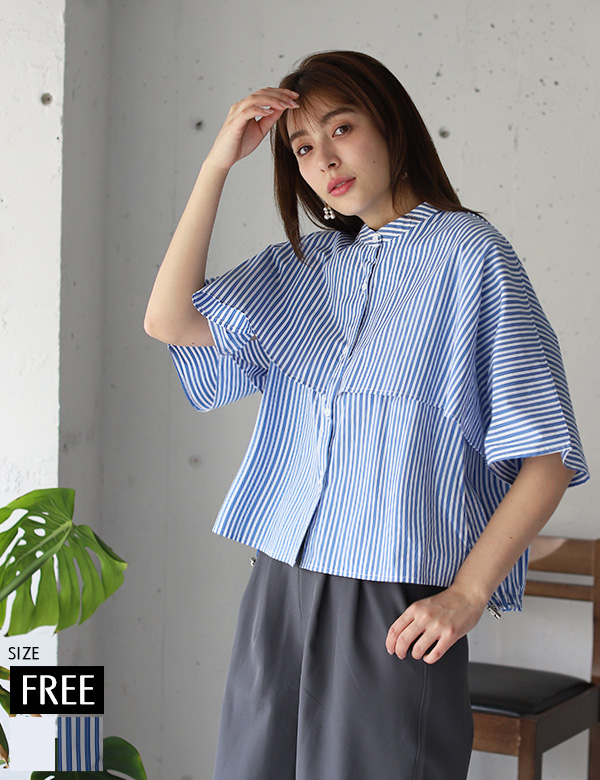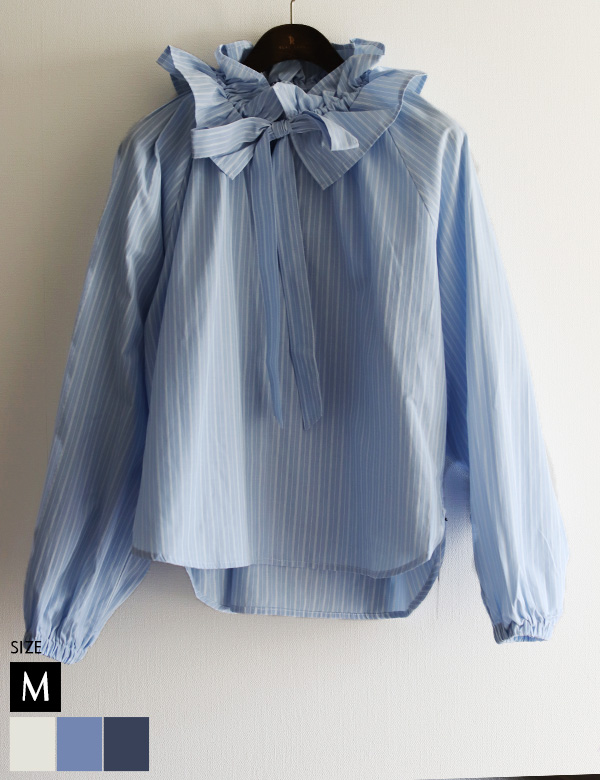 フリルカラーリボンストライプブラウス