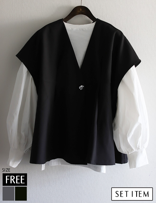 異素材切り替えボリュームスリーブトップス(