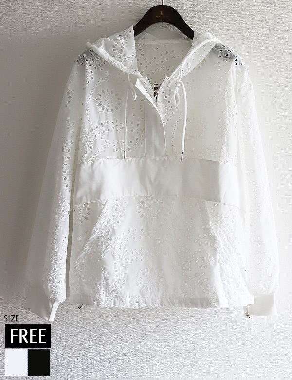 コットンレースハーフジップフーディー